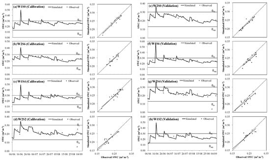 Simulated and observed soil water content (SWC) during the whole growth period of alfalfa in 2018: (a) W1S0, (b) W2S6, (c) W1S4 and (d) W2S2 for calibration; (e) W2S0, (f) W1S6, (g) W2S4 and (h) W1S2 for validation. On the right panel the corresponding regressions forced to the origin were shown. W1 and W2 indicated full irrigation and deficit irrigation. S0, S2, S4 and S6 indicated 0‰, 2‰, 4‰ and 6‰ mass ratio of salt per unit soil mass in the depth of 0–60 cm. The same as below.