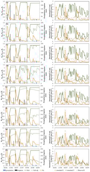 Seasonal variations of soil evaporation coefficient (Ke), basal crop coefficient (Kcb), adjusted Kcb (Kcb adj), precipitation and irrigation during the whole growth period of alfalfa in 2018. On the right panel, the simulated crop transpiration (T), soil evaporation (E) and observed E for the alfalfa were shown. (a)–(h): W1S0, W2S0, W1S2, W2S2, W1S4, W2S4, W1S6 and W2S6.