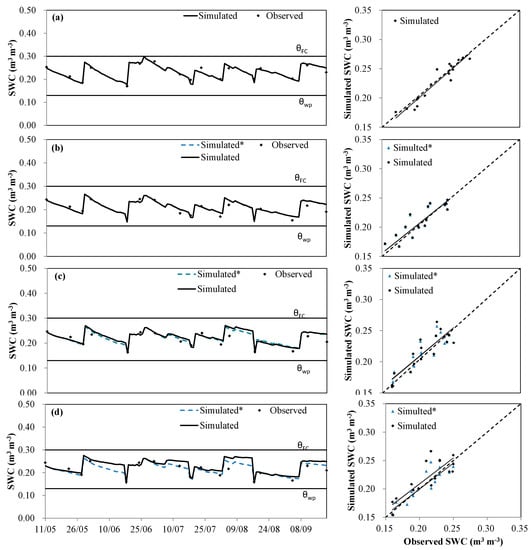 Simulated and observed soil water content (SWC) during the whole growth period of alfalfa in 2019: (a) W1S0, (b) W2S2, (c) W2S4 and (d) W2S6. The simulations with a constant yield response factor (Ky = 1.2) were shown by solid lines and dynamic Ky by dotted lines. On the right panel, the corresponding regressions forced to the origin were shown, and simulations with recomputed Ky were shown with the asterisk (*).