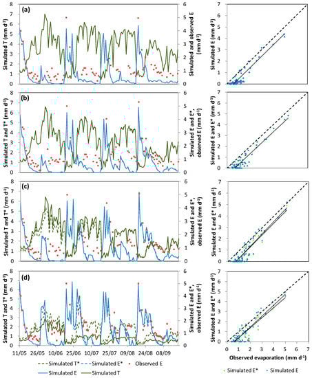 The goodness of fit indicators of E simulation are presented in Table 3. The variation trend of the simulated daily E and measurements was consistent, even not as good as the SWC, with the R2 above 0.75 and b above 0.90. Although the RMSE and AAE were relative larger and EF and dIA lower, overall simulations of E were acceptable considering the complexity of the influencing factors. The simulated values in this study tended to underestimate, which were similar with previous studies [16,18,19]. On the other side, measurements might be overestimated, for (a) water extraction by roots was excluded from the microlysimeters, resulting in higher soil water content in the microlysimeters than in the surrounding area, hence making that microlysimeters measurements are likely to overestimate soil evaporation; (b) due to the gap between the inner wall and the outer wall of microlysimeters, the actual evaporation of soil inside could be affected by the thermal effect. Wei et al. [16] noticed that model underestimations occurred when the crop was well developed, i.e., the fraction of ground cover was high and soil evaporation was low, and root extraction from the upper soil layer was higher. Therefore, the soil water extraction from the evaporation soil layer is larger when roots are active compared with that in microlysimeters, as the latter’s extraction due to soil evaporation only, which was in agreement to our result.