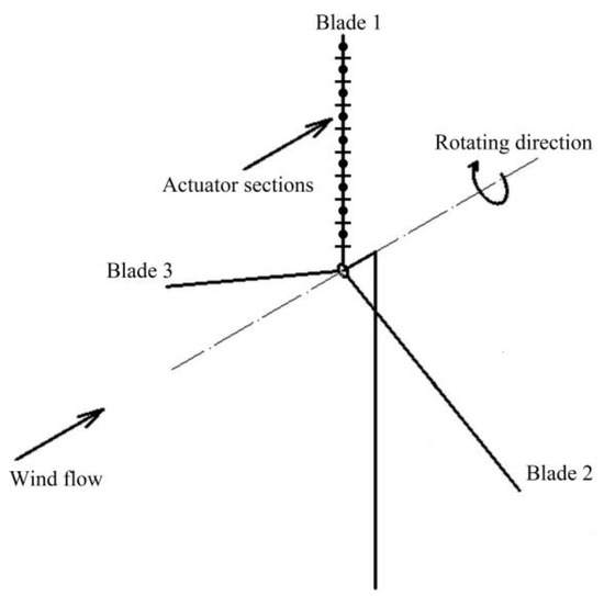Blades represented by actuator line and discretized into actuator sections.