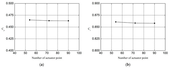 Relationship between actuator point number and aerodynamic coefficient, (a) power coefficient, and (b) thrust coefficient.