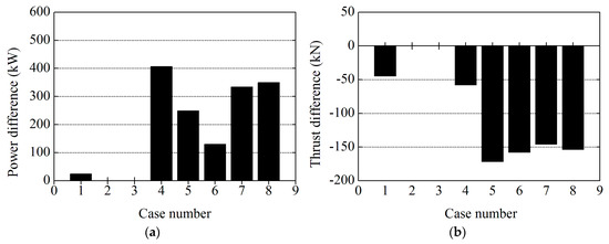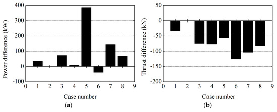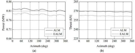 Comparisons of the aerodynamic performance results between traditional actuator line model (ALM) and elastic actuator line model (EALM) at 8 m/s: (a) power; and (b) thrust.