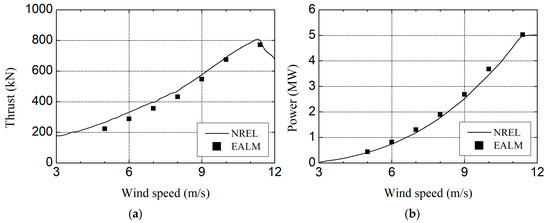 Comparisons of the aerodynamic performance results between elastic actuator line model (EALM) and NREL’s FAST code at different wind speeds: (a) thrust; and (b) power.
