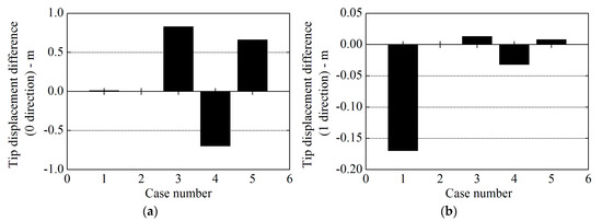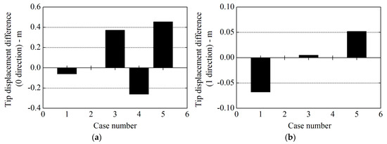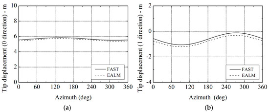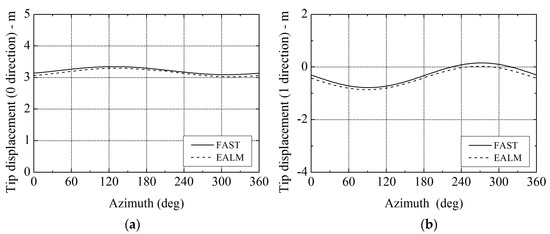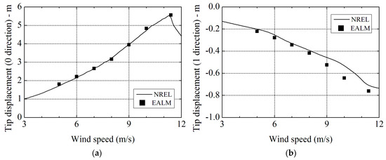 Comparison of the tip displacement results between elastic actuator line model (EALM) and NREL’s FAST code at different wind speeds: (a) in 0 direction; and (b) in 1 direction.
