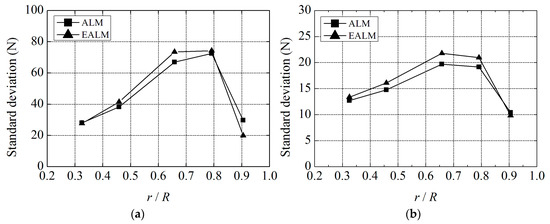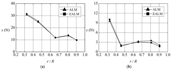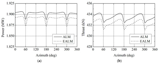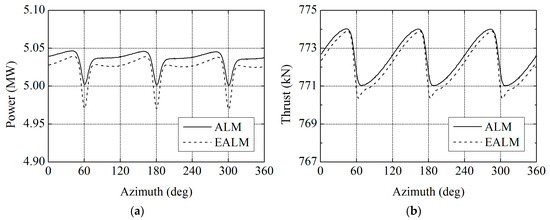 Comparisons of the aerodynamic performance results between traditional actuator line model (ALM) and elastic actuator line model (EALM) at 11.4 m/s: (a) power; and (b) thrust.