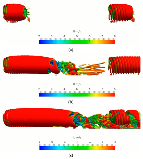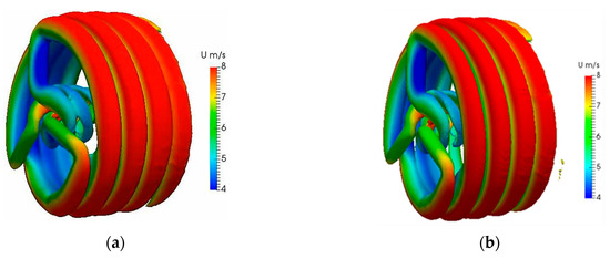 The wake structures in terms of Q field at 8 m/s: (a) by EALM; and (b) by ALM.