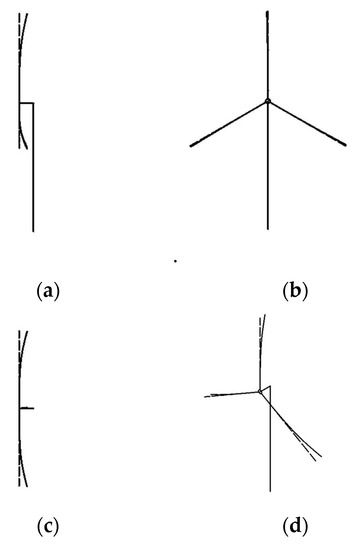 The abbreviated sketches of blade deflection: (a) front side view; (b) left side view; (c) vertical side view; and (d) southwest isometric side view.