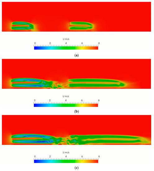 The wake velocity field development of double wind turbine aligned: (a) initial status without disturb; (b) developing status; and (c) interference status.