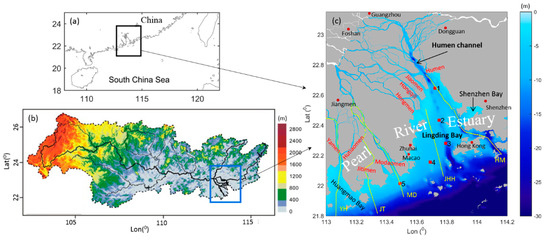 In recent decades, concerns about the fate and transport timescales of TeDS have risen in highly populated river delta areas. Being an estuary with complex river networks and profound anthropogenic impacts, the Pearl River Estuary (PRE) is a good candidate to investigate TeDS transport processes. The PRE is a large and productive estuary located in the Guangdong–Hong Kong–Macao Greater Bay Area of southern China (Figure 1). The PRE has eight outlets (Humen, Jiaomen, Hongqili, Hengmen, Modaomen, Jitimen, Hutiaomen and Yamen) and several bays and sub-estuaries (Lingding Bay, Modaomen estuary, Jitimen estuary, Huangmao Bay, and Shenzhen Bay). The Lingding Bay is the largest bay in the PRE. The water body of the PRE receives a high load of anthropogenic organic pollutants from increased industry, agricultural activities, fish dike farming and sewage effluents [19,20,21]. The degradation of the water quality and ecological condition of the PRE has been frequently reported [21,22,23,24]. Data released by the 2016 Guangdong Marine Environment Bulletin indicated that the total mass of pollutants released into the Pearl River in 2016 was 2.03 × 106 tons, which includes chemical oxygen at 1.52 × 106 tons, ammonia at 2.82 × 104 tons, nitrate at 4.12 × 105 tons, nitrite nitrogen at 2.74 × 104 tons and total phosphorus at 2.40 × 104 tons. Because of the large number of rivers and streams and frequent precipitations events in the Pearl River Delta (PRD), surface runoff is a major source of contaminants and nutrient loads in the adjacent coastal water. Large amounts of wastes and nutrients are continuously generated throughout the PRD, resulting in a substantial increase in the number of contamination sources and a deterioration of water quality and ecological conditions in the PRE.