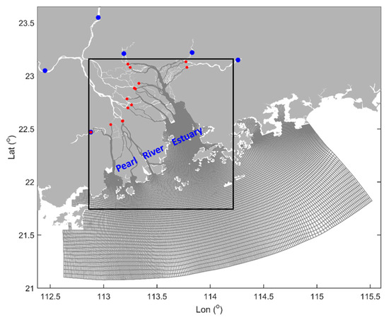 Model grids. The red dots mark the locations where the upstream river flow entered the model domain and the blue dots represent the gauge stations where in situ daily river flow measurements were obtained in the major tributaries of the Pearl River.