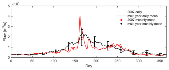Daily and monthly flow of the Pearl River (summation of river flow measured at blue gauge stations in Figure 2) in 2007. The multi-year (2000–2014) mean daily and monthly river discharge and its standard deviation are also plotted for comparison.