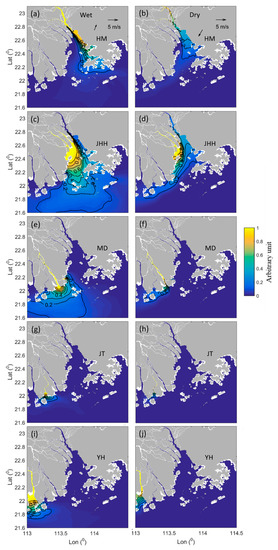 Tracer concentrations (arbitrary unit) in the case of tracers entering the domain from the HM (a,b), JHH (c,d), MD (e,f), JT (g,h) and YM (i,j) outlets, respectively. High tracer concentrations indicate potentially high TeDS concentrations. Left panels: typical wet season (monthly mean result in June). Right panels: typical dry season (monthly mean result in January). The corresponding monthly mean wind velocity (m/s) is superimposed on the top panel.