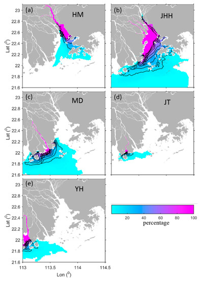 To clarify the domains that can be influenced by each outlet, we calculated the total percentage of time that the tracer concentrations were greater than 0.2 (arbitrary unit) in a year. It could be expected that the direct influence of each outlet group disappeared in areas when the percentage was zero, while the major influenced spots could be identified as those with a high percentage. The results (Figure 5) revealed that the influence of the HM outlet only dominated in the upper eastern part of the Lingding Bay, as the lower bay experienced tracer concentrations greater than 0.2 (arbitrary unit) only 20%–30% of the time during one year. For tracers coming from the JHH outlets, the major influenced area (with a percentage greater than 60%) covered a significant portion of the Lingding Bay. This indicates that high concentrations of TeDS could be observed very frequently in this area. In the coastal area adjacent to the PRE mouth, the percentage was around 40%. The westward and southeastward transport showed relatively higher percentages than other directions did. The MD outlet resulted in a high percentage along the coastline. This indicates that the impacts of TeDS decrease toward the offshore regions. The percentages of westward and southeastward tracer transport were relatively higher than that in other directions. The JT and YH outlet groups had a limited impact, with significant seaward spreading occurring less than 10% of the time during one year.