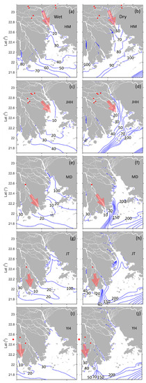Transport time (days) of tracers coming from the HM (a,b), JHH (c,d), MD (e,f), JT (g,h) and YH (i,j) outlets. Left panel: typical wet season (monthly mean result in June). Right panel: typical dry season (monthly mean result in January). The spots for tracers entering the domain are marked by the red dots in each case, and are also part of the river inflow locations shown in Figure 2.