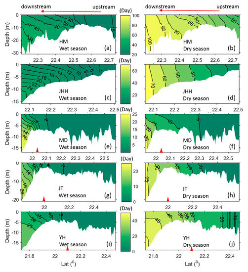 Transport time (days) along the five transects: (a,b) HM; (c,d) JHH; (e,f) MD; (g,h) JT; (i,j) YH. For each transect, the wet season (left column, averaged in June) and dry season (right column, averaged in January) conditions are plotted. The locations of these transects are indicated in Figure 1c, which follows the major pathways of the tracers according to the results in Section 3.1. The upstream and downstream directions are indicated. The red triangles (in (e–j)) indicate the entrance of each outlet.