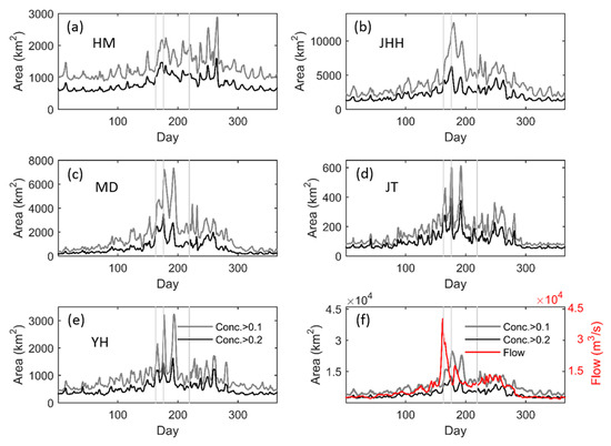Tracer impacted area (km2), calculated by the area with a tracer concentration greater than 0.2 (black lines). For comparison, the area with a tracer concentration > 0.1 (gray lines) was also calculated. (a) HM; (b) JHH; (c) MD; (d) JT; (e) YH. The areas were calculated from the model run of each case. (f) The total impacted area was calculated by adding the impacted area of each outlet group, with the overlapped area excluded. The river flow is also superimposed.