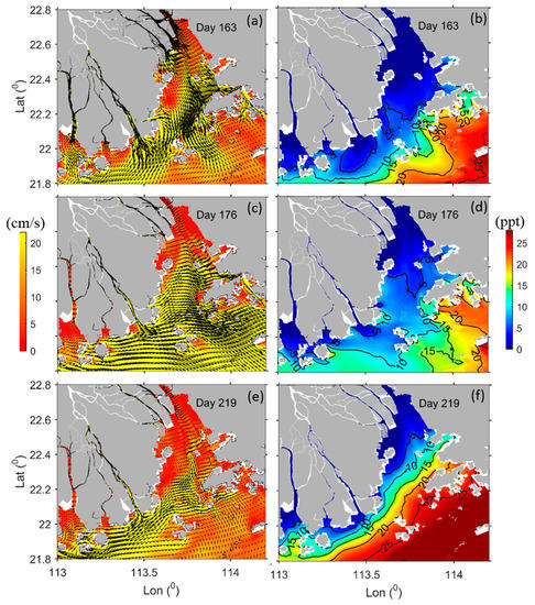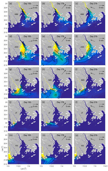 We noticed that the pathways, tracer concentrations and the impacted area showed large variations under different hydrodynamic conditions. The circulation and salinity conditions on day 163, 176 and 219 are presented in Figure 10. On day 176 (Figure 10c), the current directions of the lower estuary and the inner shelf are mostly eastward, with a strong southeastward flow appearing in the area adjacent to the PRE mouth. Such eastward flow disappears on days 163 and 219. However, the southwestward flow is strong along the west coast of the PRE on days 163 and 219 (Figure 10a,e), while the circulation on day 219 is much weaker. The distribution of salinity (Figure 10b,d,f) is used to show the freshwater distribution. It seems that the southwesterly wind facilitates offshore transport of the river plume, while the southeasterly wind tends to push the river plume flow westward along the west coast of the PRE. More detailed analyses on the wind effects will be performed in a separate paper. In this study, we focused on identifying the relative contributions of each outlet group and their impacted domains.