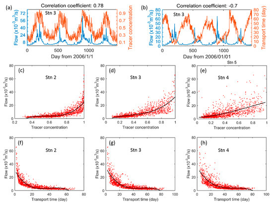 (a) Time series of the flow and tracer concentrations at station 3. The correlation coefficient is 0.78; (b) Time series of the flows and transport times at station 3. The correlation coefficient is −0.70. (c–e) Scatter diagram of the flows and tracer concentrations at stations 2, 3 and 4; (f–h) scatter diagram of the flow and transport times at stations 2, 3 and 4. The polynomial fitting is superimposed for (c–h).