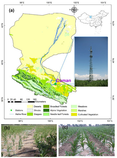 Location of the study site (Daman) in the Heihe River Basin (HRB) and in the North-Western China. The right figure shows the flux tower measurement in the Daman (a). The below figures show drip irrigation under mulch film (b,c).