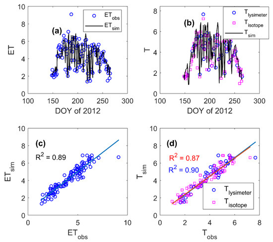 Comparisons of different evapotranspiration partitioning methods with the Penman-Monteith-Leuning model and measurements of lysimeter and isotope methods. The performance of the model was validated by using the flux tower measured Evapotranspiration (ET) (a,c), and the lysimeter and isotope observed transpiration (T) (b,d). (a,b) showed the time series results of the validation, while (c,d) showed the scatter plot of the validated results.