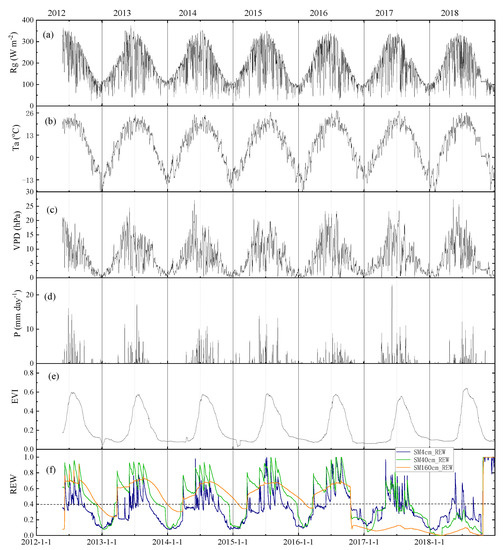 Temporal variations in daily mean solar radiation (Rg, W m−2) (a), air temperature (Ta, °C) (b), vapor pressure deficit (VPD, hpa) (c), daily integrated precipitation (P, mm) (d), enhanced vegetation index (EVI) (e), and relative extractable water (REW) (f) at different depths.