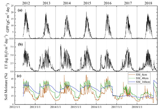 Temporal variations in daily gross primary production (GPP) (a), evapotranspiration (ET) (b), and soil moisture (SM) (c) at different depths. Before 2017, flood-irrigation were used in the study site, while the drip irrigation were performed since the beginning of growing season in 2017.