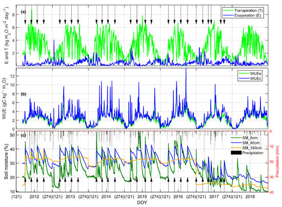 Both ecosystem WUE (g C kg−1 H2O) and canopy WUE were used in this study. The ecosystem WUE (WUEe) was defined as WUEe = GPP/ET, where GPP (g C m−2 day−1) is gross primary productivity and ET (kg H2O m−2 day−1) is evapotranspiration. ET were obtained from the eddy covariance measured latent heat flux (LE, W m−2). The canopy WUE was defined as WUEc = GPP/T [52], where T is transpiration. The T was partitioned from the ET measurements, which are introduced in detail in Section 2.6. WUE was analyzed for daily, monthly, and annual time-steps. The monthly and annual WUE were derived from the summation of GPP and ET components with corresponding time scales.