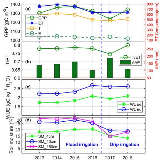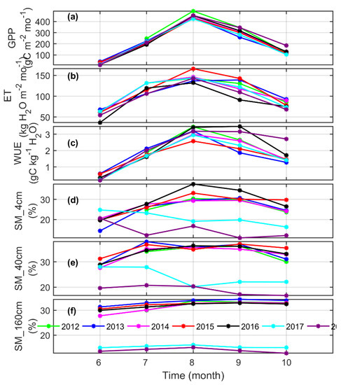 Monthly GPP, ET, and WUE peaked in July over the six-year period (Figure 6). Unlike GPP, there are clear inter-annual variations of monthly ET, WUE, and soil moisture. There were significantly decreased trends for soil moisture in 2017 and 2018 after the change of irrigation practice, especially for the deep layers. Also shown in Figure 4 and Figure 5, the monthly average soil moisture of both surface and middle layers in the growing seasons was still occasionally affected by a relatively large amount of irrigation in 2017. However, this had no significant effects on the soil moisture in 2018.