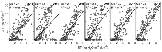 Relationship between daily gross primary production (GPP) and evapotranspiration (ET) during the periods of 2013–2018. The symbol ** indicates the statistical significance level of 0.01.