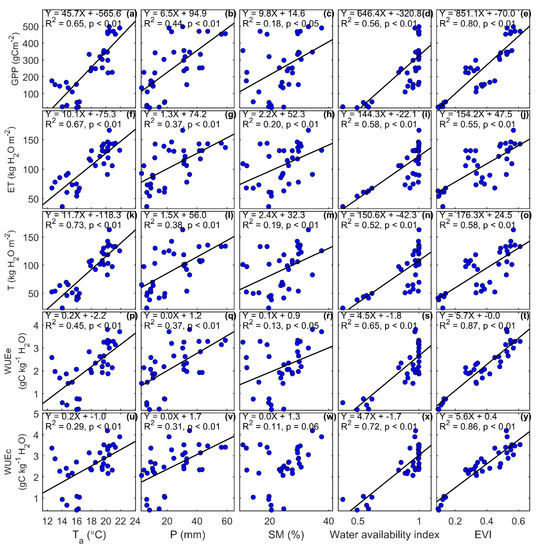 Relationship of monthly gross primary production (GPP) (a–e), evapotranspiration (ET) (f–j), transpiration (T) (k–o), water use efficiency at ecosystem level (WUEe) (p–t) and canopy level (WUEc) (u–y) with environment variables that including monthly mean air temperature (Ta), precipitation (P), soil moisture at 4 cm layer (SM), water availability index, and EVI during the growing seasons (i.e., periods from May to September).