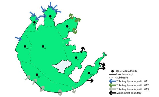 Based on upstream catchment sub-basins [] and the boundary condition of the hydrodynamic model [], inflow tributary boundaries have been categorized into three groups for the WA simulation (Figure 1). For each group of boundaries, a set of conservative and decayable tracers are continuously released, with the decay rate of the decayable tracers set to be 0.01/day. The northern and northwestern boundaries mainly represent the discharges from Jiangsu province (WA1), while the southern and southwestern boundaries include mountainous river discharges and tributaries from Zhejiang province (WA2). Northeastern boundaries mainly account for water transfer from the Yangtze River (WA3). The WA simulation time step is the same as in the hydrodynamic model, and the model result is recorded at every 6 h of model time. Note, both inflow and outflow occur in the above-mentioned boundaries throughout the year. Tracers released with the outflow boundary condition will be transported out of the model domain and not be included in the WA calculation. Based on Taihu Lake’s geometry and hydrological features, the lake is divided into seven sub-basins. For each sub-basin, an observation point is set to monitor the WA distribution (Figure 1).