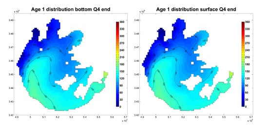 Influenced by the time-varying wind field and hydrodynamics, WA distribution for all three groups of tracers changed both spatially and temporally. Bottom and surface WA1 distribution at the last time-step of Scenario 1 is shown in Figure 2. Little WA1 vertical difference (∼0.01 day) between the surface and bottom layer is observed from the model result, as well as in WA2 and WA3. The consistency in vertical WA distribution implies that, although surface and bottom horizontal flow velocity fields differ hugely [], WA is fully mixed in vertically within each time step.