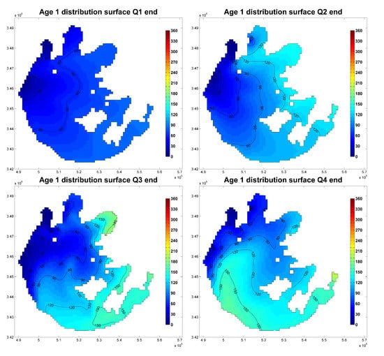 The most common definition of water age is given as “the time that has elapsed since the particle under consideration left the region in which its age is prescribed as being zero” [,]. Thus, particularly in this study, WA is defined as the time elapsed since the tributary water with dissolved nutrients entered the lake water body, with WA being equal to zero at the boundary between the connected river network and the lake water.