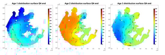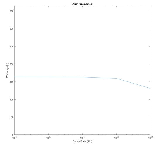 In this study, water age is calculated with a concentration of both conservative and decayable tracers, as described in Section 3.4. In previous studies, it is usually referred to as “radio-age” []. However, theoretically, the value is between the water age of passive tracers (or water parcels) and of radioactive tracers. A 10% bias with water age larger than 7 years has also been reported []. Choice of decay rate is crucial for the modelled radio age value, and with a smaller decay rate, the difference between radio-age and water age of passive tracers is small (Equation (9)).