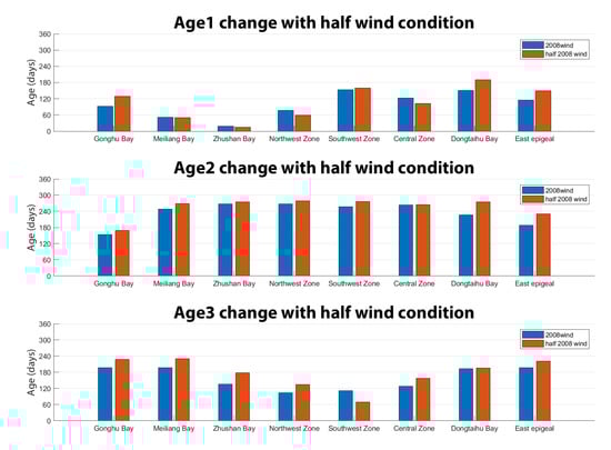 Water age comparison between the 2008 real wind data scenario and half wind speed scenario.