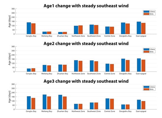 The initial water age study mainly has two applications: (a) To assess the ventilation rate of semi-closed basins; (b) to infer the horizontal circulation, which focuses more on estuaries and lagoons []. Further studies in broader aqua systems have paid more attention to water quality issues, such as the efficiency of water transfer []. With climate change and a more complicated nutrient control policy, water age is able to provide more assistance in integrated water quality management of shallow lakes, such as Taihu Lake.