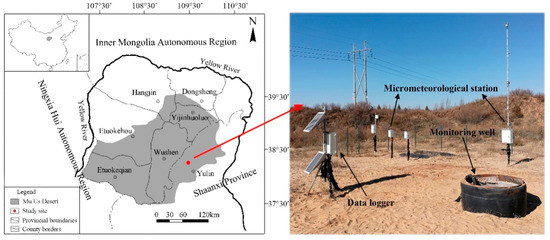 The Mu Us Desert is located between the Ordos Plateau and the Loess Plateau in northwestern China (Figure 1), in the north part of the Shaanxi Province, northeast of the Ningxia Hui Autonomous Region, and south of the Inner Mongolia Autonomous Region. The climate in the desert can be characterized as dry and cold, with large temperature differences and frequent strong winds. Based on the meteorological data since 1961, annual temperatures range from −31.4 to 36.4 °C, with an average annual temperature of 6.4 °C. Mean annual precipitation and potential evaporation are 360 and 2343 mm, respectively, and over 60% of the annual rainfall occurs from July to September [33,34]. Total annual sunshine time exceeds 3000 h, with total radiation of 608.37 kJ/cm2. The Mu Us Desert is typically subject to seasonal freezing, with the freeze-thaw process from November to March. The frozen layer usually extends to 100 cm below the soil surface.