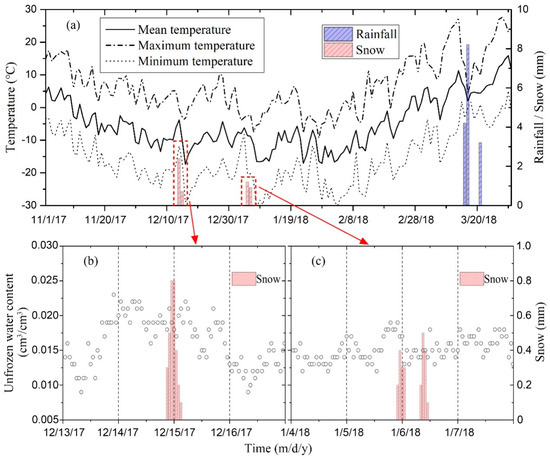 (a) Measured air temperature, rainfall, and snow during the period from November 2017 to March 2018 at the study site; and (b,c) unfrozen water content at the 10 cm depth during two snow periods.