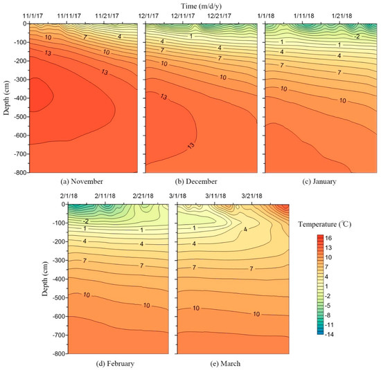 Spatial and temporal variations of soil temperatures during the months of (a) November 2017, (b) December 2017, (c) January 2018, (d) February 2018, and (e) March 2018.