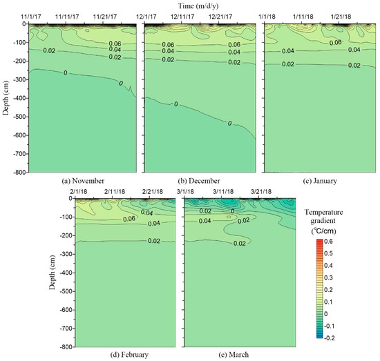 Spatial and temporal variations of soil temperature gradients during the months of (a) November 2017, (b) December 2017, (c) January 2018, (d) February 2018, and (e) March 2018. The temperature gradient was calculated as ΔT/Δz = (Ti+1 − Ti)/Δz, where Ti+1 and Ti are soil temperatures at depths i and i + 1, respectively, and Δz is the vertical distance between depths i and i + 1.