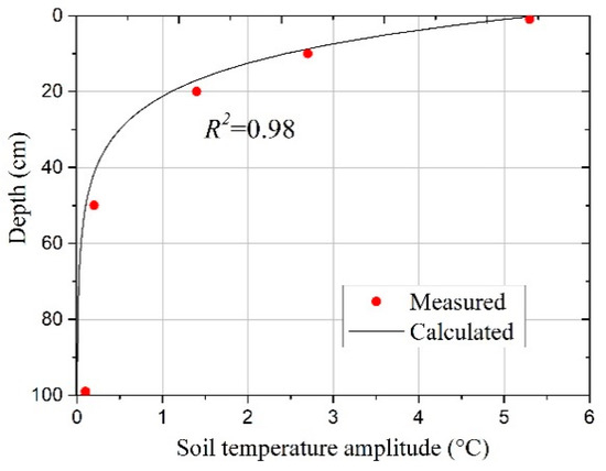 As the soil in this study is relatively dry (as discussed below in detail), the effect of the specific heat of freezing/thawing can be neglected, and the Equation (3) can be used to approximate soil temperatures with depth at subzero temperatures as well. Figure 5 illustrates measured and calculated (with T0 = −2.1 °C, A0 =5.4 °C, and KT =20.7 cm2/h) diurnal soil temperature amplitudes as a function of depth. The results show that calculated and measured temperature amplitudes agreed well, with a correlation coefficient of 0.98. The observed diurnal temperature amplitude at the soil surface, and at depths of 10 and 20 cm, were 5.4, 2.7, and 1.4 °C, respectively, while the amplitude became much smaller (less than 0.1 °C) below the 100 cm depth. Calculated values were always slightly lower than measured values, which was mainly because the measured amplitude at a depth of 2 cm was adopted to represent temperature variations at the soil surface, resulting in a lower value of the diurnal temperature amplitude at the surface (A0).