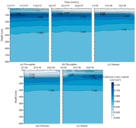 Spatial and temporal variations of the soil unfrozen water contents during the months of (a) November 2017, (b) December 2017, (c) January 2018, (d) February 2018, and (e) March 2018.