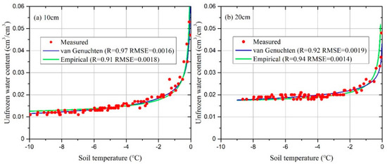 The relationship between the unfrozen soil water content and soil temperature at depths of 10 (a) and 20 (b) cm. Figures show experimental data, as well as the van Genuchten (Equation (5)) and empirical (Equation (6)) functions. R is the correlation coefficient, and RMSE is the root mean square error (cm3/cm3).