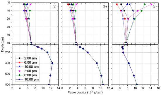 Figure 8 shows the distribution of the vapor density in the soil profile at three typical dates: before freezing (on 16 November), during the stable freezing stage (on 1 February), and after melting (on 25 March). Before the freezing period started, the vapor density was much smaller in the shallow soil layer than below it, while the maximum value of 12.5 × 10−6 g/cm3 occurred at the 400 cm depth. During the freezing period, the pressure head and soil temperatures in the frozen layer decreased sharply, resulting in a low vapor density and an upward vapor density gradient in the vadose zone. By comparison, the vapor density in the shallow layer increased significantly after melting, and the soil depth between 100 and 200 cm had the lowest vapor density (around 6.7 × 10−6 g/cm3). Additionally, the vapor density in the top 20 cm soil layer showed diurnal variations in all three cases, with an upward gradient of the vapor density during nighttime and a downward gradient of the vapor density during the daytime.