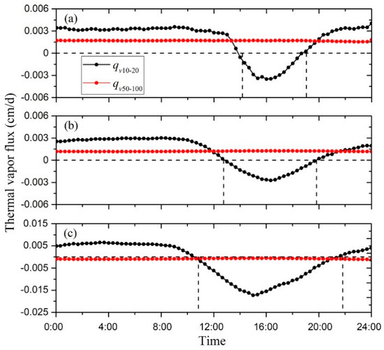Diurnal variations of the thermal vapor flux at two layers (10–20 and 50–100 cm) on different days: (a) 16 November, (b) 1 February, and (c) 25 March. qv10–20 and qv50–100 are calculated vapor fluxes in soil layers 10–20 and 50–100 cm, respectively. Positive values indicate upward vapor flow, while negative values indicate downward vapor flow.