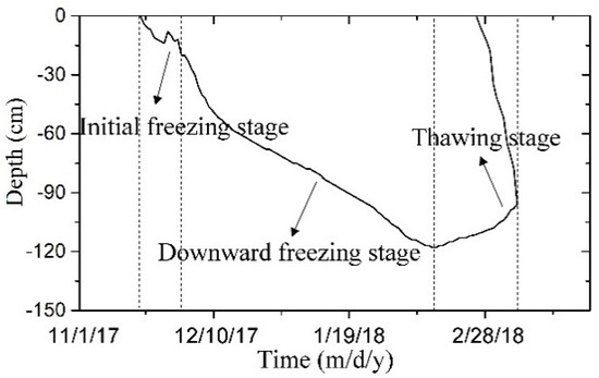 The freezing depth, defined as the depth with zero temperature, is often used to characterize the freeze-thaw process [9,26], as shown in Figure 10. According to the measured soil temperature and moisture data, the total freeze-thaw process, with the maximum freezing depth to be at a depth of 118 cm, lasted 112 days (from 19 November 2017, to 10 March 2018), and could be divided into three main stages: the initial freezing stage, the downward freezing stage, and the thawing stage.