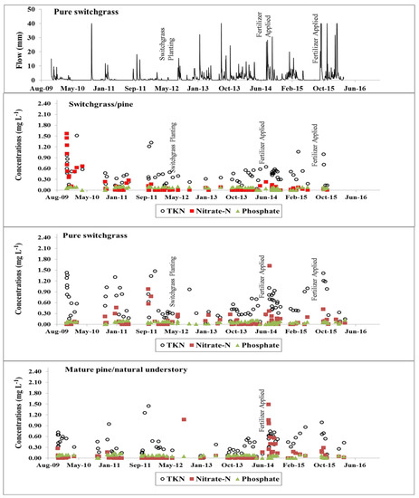 - Beltran, B.J.; Amatya, D.M.; Youssef, M.; Jones, M.; Callahan, T.J.; Skaggs, R.W.; Nettles, J.E. Impacts of fertilization on water quality of a drained pine plantation: A worst case scenario. J. Environ. Qual. 2010, 39, 293–303. [Google Scholar] [CrossRef] [PubMed]