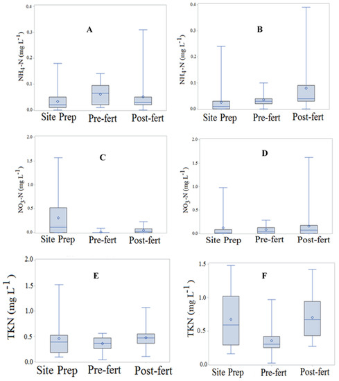 3.2. Comparisons of Post-Fertilization Water Quality Variables to those of the Pre-Fertilization and Site Preparation Periods