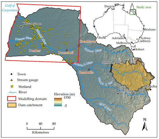 This study focused on the Mitchell river basin in tropical Australia. It encompasses an area of 71,530 km2 and extends from Mareeba in the headwater catchment to Kowanyama at the outlet to the Gulf of Carpentaria (Figure 1). Major tributaries of the Mitchell River are the Palmer and Lynd rivers with contributing areas of 45,145 km2. About 95% of the catchment land is occupied by pastures and shrubs. About 3% of the land is conservation reserve. This area is characterised by two distinctive seasons, wet and dry. The average rainfall in the catchment varies in the range of 1000 mm per year and about 90% of total rainfall occurs during the wet season (November to April). Annual potential evaporation is about 1750 mm with a strong seasonal pattern, ranging from monthly average of 200 mm during October to December to about 100 mm during the dry season [40].